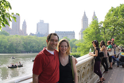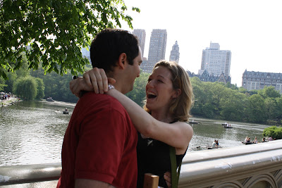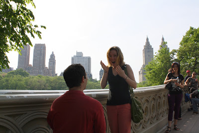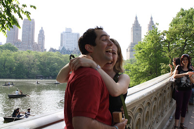 We continued walking up to and through Central Park. She kept asking if we could just sit down and enjoy the weather, but I was on a strict schedule, so I politely said we just had a little farther to go. We finally got to the little lake in the middle of the park. There were people rowing in boats, and I could tell she wanted to go so I said maybe we could get one. We made our way around to the lake to the final spot – Bow Bridge. I asked her to stand by the rail and I would take her picture with the city in the background. The was necessary because I had to make sure the camera was in focus (it’s a Canon Rebel, not a little point and shoot) for whomever I was going to get to take our picture. Once I was pleased with the shot, I looked for someone to take our picture. There were two couples talking beside me, looked to be in their early 50’s, so I asked one of the women if she would take our picture. To my surprise, she said no! She said she would probably ruin it, laughed, and said that her husband would though. I gave him the camera, and as I’m walking over to Sara, I’m reaching into the bag to pull the ring box, but all I’m finding is the front of my shoes. When I had put the box in the shoes, which were in the front of the bag, the bag was on my left shoulder. But now the bag was on my right shoulder so everything was reversed. I figured it out just as I was coming up to Sara and setting the bag down, but I got the box out in time. Unfortunately, for all my months and months of planning, I had thought of everything EXCEPT what I was going to do at that exact moment. And I froze. The gentleman snapped a picture and was bringing us the camera when I asked if he would take one more. I then gave Sara a squeeze with the arm I had around her, told her “I love you so much,” and got down on a knee. She screamed.