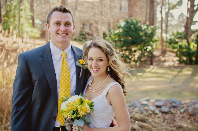 Lovely yellow bouquet, ties, and billy button cake toppers!