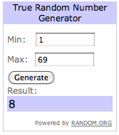 Once again, thank you so much for your support over the last two years. And thanks to all who entered my celebration giveaways, and to the lovely giver-awayers! Without further adieu, the randomly selected winners:
