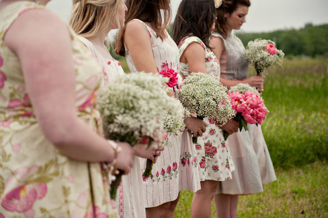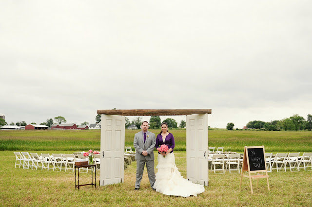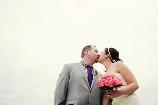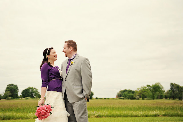 This wedding was DIY (including the florals!) from head to toe, if a wedding has a head and a toe. And it proves that rain doesn’t ruin your wedding day. In fact, it could make it better! Pretty pink peonies, a pink and purple palette, sparkly Toms, fantastic vintage elements, mismatched bridesmaids, mason jar beverage glasses, the bride’s cardigan…I just love so many things about this wedding. LOVE LOVE LOVE!