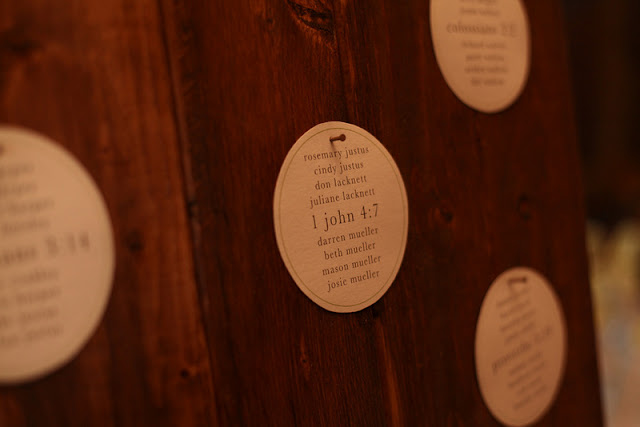 Todd proposed with a box of origami hearts with Bible verses written on them. To incorporate this, each table was a different Bible verse that Todd had written when he proposed. Our venue also had a fire pit, so we were able to have one of my favorite desserts: smores!
