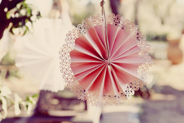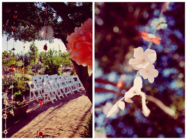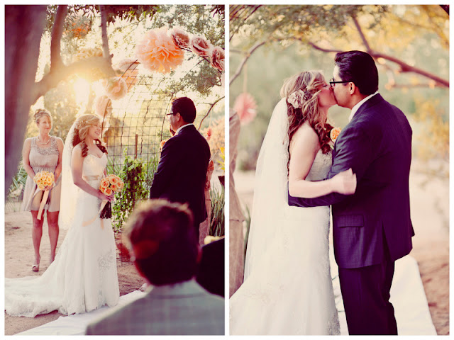 As far as how we made our wedding “us” we wanted to pull in a lot of rustic, Mexican inspiration to keep the tone of our wedding mellow and comfortable (we like to think of ourselves as being the laid back types) while still keeping things sweet, delicate and pretty. We used a lot of rustic things like burlap and cacti and then juxtaposed that with more feminine materials like ribbon and lace. Our colors were peach and cactus green with some hints of champagne and ivory. I am obsessed with garlands and hanging type decorations so we did a ton of that. We had handmade papel picado garlands imported from Mexico and the rest we made. We also had a graphic designer construct papel picado wraps for the hurricane vases on each table (as well as the matching “bride” and “groom” garlands for our chairs) and tied them with burlap twine. I stole the idea for the garland around the arch where the ceremony was from an anthroplogie display. The one at anthropologie was coffee filters only, I added additional tissue paper, lace, and ribbon. The ribbon/flower garland hanging from the trees was something I just came up with accidentally while playing with ribbon and silk flowers. Actually, so much of our decor really came from me sitting at my dining room table playing with all the pretty things I had gathered. 🙂 And of course my family and friends helped execute all my prototypes in what I called my wedding factory.